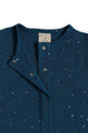 Materialul este un bumbac moale, organic, special dedicat copiilor. Culoarea este un albastru electric superb cu mici detalii aurii, care ii ofera un rafinament aparte.